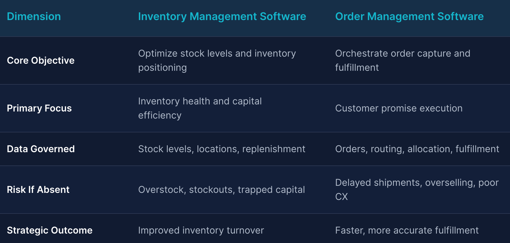 Inventory management software and order management software serve distinct but interdependent roles in modern retail operations. One governs how inventory capital is positioned and replenished. The other governs how customer promises are executed across channels.
