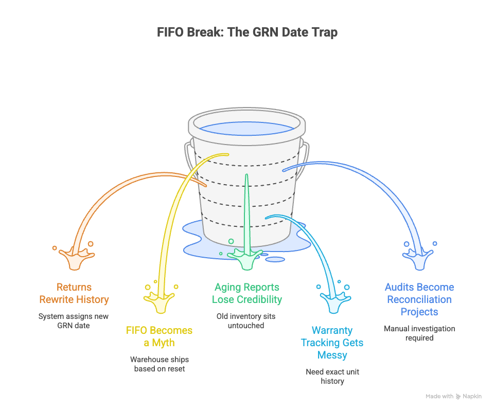 - FIFO Becomes a MythYour pick logic may be set to “oldest first,” but if returned items keep getting new GRN dates, the warehouse ends up shipping the latest resets instead of the actual oldest physical inventory.
